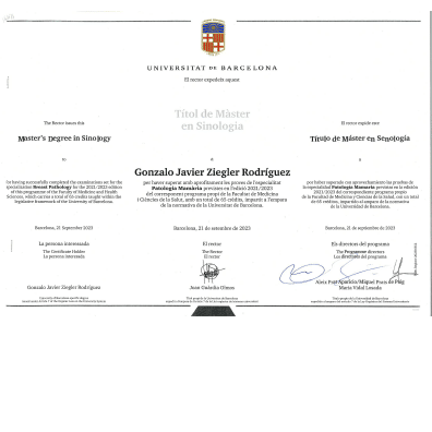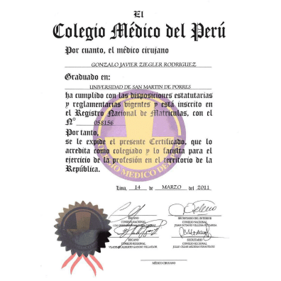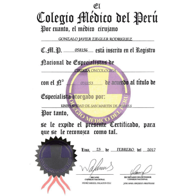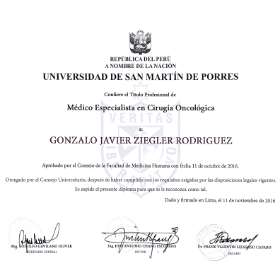 Los diplomas y titulos: Médico, Cirujano Oncólogo y Mastólogo.